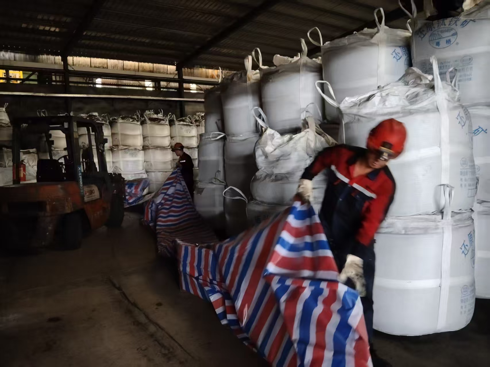 ▲員工正在將產(chǎn)品做好防水覆蓋工作